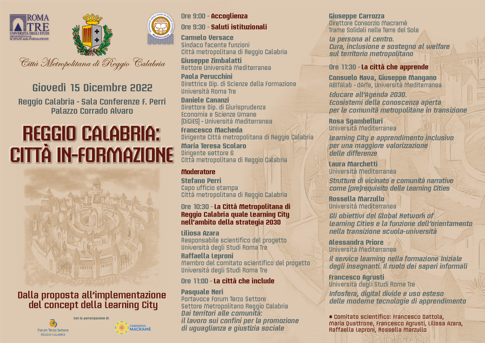 In chiusura la quarta ed ultima sessione, denominata "La Città che apprende", con Consuelo Nava e Giuseppe Mangano di ABITAlab, Dipartimento dArTe dell'Università Mediterranea, i docenti della Mediterranea Rosa Sgambelluri, Laura Marchetti, Rossella Marzullo e Alessandra Priore ed infine Francesco Agrusti di Roma Tre. Il Comitato scientifico sarà composto da Francesco Dattola, Maria Quattrone, Francesco Agrusti, Liliosa Azara, Raffaella Leproni e Rossella Marzullo.